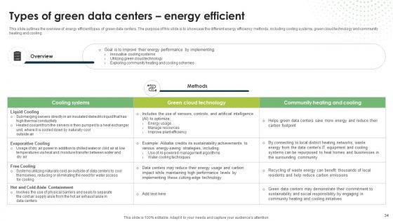 This slide outlines the overview of energy efficient types of green data centers. The purpose of this slide is to showcase the different energy efficiency methods, including cooling systems, green cloud technology and community heating and cooling.If you are looking for a format to display your unique thoughts, then the professionally designed Types Of Green Data Centers Energy Efficient Eco Friendly Computing IT is the one for you. You can use it as a Google Slides template or a PowerPoint template. Incorporate impressive visuals, symbols, images, and other charts. Modify or reorganize the text boxes as you desire. Experiment with shade schemes and font pairings. Alter, share or cooperate with other people on your work. Download Types Of Green Data Centers Energy Efficient Eco Friendly Computing IT and find out how to give a successful presentation. Present a perfect display to your team and make your presentation unforgettable. This slide outlines the overview of energy efficient types of green data centers. The purpose of this slide is to showcase the different energy efficiency methods, including cooling systems, green cloud technology and community heating and cooling.