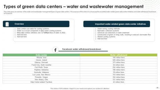 This slide gives an overview of the water and wastewater management types of green data centers. The purpose of this slide is to showcase the essential water-related green data center initiatives and water withdrawal breakdown of Facebook.Formulating a presentation can take up a lot of effort and time, so the content and message should always be the primary focus. The visuals of the PowerPoint can enhance the presenters message, so our Types Of Green Data Centers Water And Wastewater Management Eco Friendly Computing IT was created to help save time. Instead of worrying about the design, the presenter can concentrate on the message while our designers work on creating the ideal templates for whatever situation is needed. Slidegeeks has experts for everything from amazing designs to valuable content, we have put everything into Types Of Green Data Centers Water And Wastewater Management Eco Friendly Computing IT. This slide gives an overview of the water and wastewater management types of green data centers. The purpose of this slide is to showcase the essential water-related green data center initiatives and water withdrawal breakdown of Facebook.
