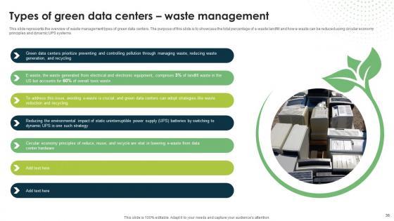 This slide represents the overview of waste management types of green data centers. The purpose of this slide is to showcase the total percentage of e-waste landfill and how e-waste can be reduced using circular economy principles and dynamic UPS systems.Make sure to capture your audiences attention in your business displays with our gratis customizable Types Of Green Data Centers Waste Management Eco Friendly Computing IT. These are great for business strategies, office conferences, capital raising or task suggestions. If you desire to acquire more customers for your tech business and ensure they stay satisfied, create your own sales presentation with these plain slides. This slide represents the overview of waste management types of green data centers. The purpose of this slide is to showcase the total percentage of e-waste landfill and how e-waste can be reduced using circular economy principles and dynamic UPS systems.