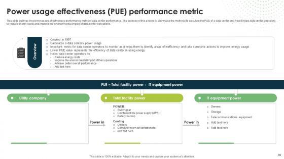 This slide outlines the power usage effectiveness performance metric of data center performance. The purpose of this slide is to showcase the methods to calculate the PUE of a data center and how it helps data center operators to reduce energy costs and improve the environmental impact of data center operations.Slidegeeks is one of the best resources for PowerPoint templates. You can download easily and regulate Power Usage Effectiveness Pue Performance Metric Eco Friendly Computing IT for your personal presentations from our wonderful collection. A few clicks is all it takes to discover and get the most relevant and appropriate templates. Use our Templates to add a unique zing and appeal to your presentation and meetings. All the slides are easy to edit and you can use them even for advertisement purposes. This slide outlines the power usage effectiveness performance metric of data center performance. The purpose of this slide is to showcase the methods to calculate the PUE of a data center and how it helps data center operators to reduce energy costs and improve the environmental impact of data center operations.