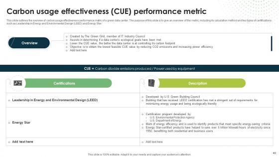 This slide outlines the overview of carbon usage effectiveness performance matric of a green data center. The purpose of this slide is to give an overview of the metric, including its calculation method and two types of certifications such as Leadership in Energy and Environmental Design LEED and Energy Star.Create an editable Carbon Usage Effectiveness Cue Performance Metric Eco Friendly Computing IT that communicates your idea and engages your audience. Whether you are presenting a business or an educational presentation, pre-designed presentation templates help save time. Carbon Usage Effectiveness Cue Performance Metric Eco Friendly Computing IT is highly customizable and very easy to edit, covering many different styles from creative to business presentations. Slidegeeks has creative team members who have crafted amazing templates. So, go and get them without any delay. This slide outlines the overview of carbon usage effectiveness performance matric of a green data center. The purpose of this slide is to give an overview of the metric, including its calculation method and two types of certifications such as Leadership in Energy and Environmental Design ,LEED and Energy Star.
