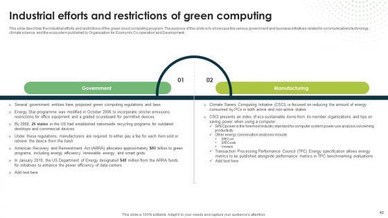 This slide describes the industrial efforts and restrictions of the green cloud computing program. The purpose of this slide is to showcase the various government and business initiatives related to communications technology, climate science, and the ecosystem published by Organization for Economic Co-operation and Development.Retrieve professionally designed Industrial Efforts And Restrictions Of Green Computing Eco Friendly Computing IT to effectively convey your message and captivate your listeners. Save time by selecting pre-made slideshows that are appropriate for various topics, from business to educational purposes. These themes come in many different styles, from creative to corporate, and all of them are easily adjustable and can be edited quickly. Access them as PowerPoint templates or as Google Slides themes. You do not have to go on a hunt for the perfect presentation because Slidegeeks got you covered from everywhere. This slide describes the industrial efforts and restrictions of the green cloud computing program. The purpose of this slide is to showcase the various government and business initiatives related to communications technology, climate science, and the ecosystem published by Organization for Economic Co-operation and Development.