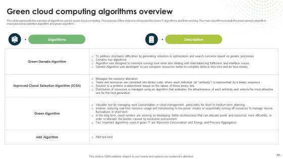 This slide represents the overview of algorithms used in green cloud computing. The purpose of this slide is to showcase the Green IT algorithms and their working. The main algorithms include the green generic algorithm, improved clonal selection algorithm, and green algorithm.Find highly impressive Green Cloud Computing Algorithms Overview Eco Friendly Computing IT on Slidegeeks to deliver a meaningful presentation. You can save an ample amount of time using these presentation templates. No need to worry to prepare everything from scratch because Slidegeeks experts have already done a huge research and work for you. You need to download Green Cloud Computing Algorithms Overview Eco Friendly Computing IT for your upcoming presentation. All the presentation templates are 100 percent editable and you can change the color and personalize the content accordingly. Download now This slide represents the overview of algorithms used in green cloud computing. The purpose of this slide is to showcase the Green IT algorithms and their working. The main algorithms include the green generic algorithm, improved clonal selection algorithm, and green algorithm.