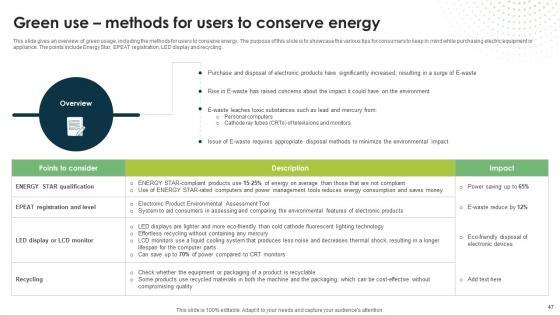 This slide gives an overview of green usage, including the methods for users to conserve energy. The purpose of this slide is to showcase the various tips for consumers to keep in mind while purchasing electric equipment or appliance. The points include Energy Star, EPEAT registration, LED display and recycling.Coming up with a presentation necessitates that the majority of the effort goes into the content and the message you intend to convey. The visuals of a PowerPoint presentation can only be effective if it supplements and supports the story that is being told. Keeping this in mind our experts created Green Use Methods For Users To Conserve Energy Eco Friendly Computing IT to reduce the time that goes into designing the presentation. This way, you can concentrate on the message while our designers take care of providing you with the right template for the situation. This slide gives an overview of green usage, including the methods for users to conserve energy. The purpose of this slide is to showcase the various tips for consumers to keep in mind while purchasing electric equipment or appliance. The points include Energy Star, EPEAT registration, LED display and recycling.
