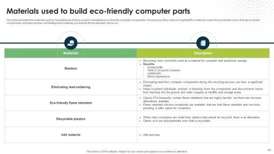 This slide illustrates the materials used by manufacturers that are used to manufacture eco-friendly computer components. The purpose of this slide is to highlight the materials used in the production of eco-friendly computer components, including bamboo, eliminating lead soldering, eco-friendly flame retardant, and so on.Here you can discover an assortment of the finest PowerPoint and Google Slides templates. With these templates, you can create presentations for a variety of purposes while simultaneously providing your audience with an eye-catching visual experience. Download Materials Used To Build Eco Friendly Computer Parts Eco Friendly Computing IT to deliver an impeccable presentation. These templates will make your job of preparing presentations much quicker, yet still, maintain a high level of quality. Slidegeeks has experienced researchers who prepare these templates and write high-quality content for you. Later on, you can personalize the content by editing the Materials Used To Build Eco Friendly Computer Parts Eco Friendly Computing IT. This slide illustrates the materials used by manufacturers that are used to manufacture eco-friendly computer components. The purpose of this slide is to highlight the materials used in the production of eco-friendly computer components, including bamboo, eliminating lead soldering, eco-friendly flame retardant, and so on.
