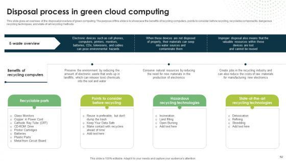 This slide gives an overview of the disposal procedure of green computing. The purpose of this slide is to showcase the benefits of recycling computers, points to consider before recycling, recyclable components, dangerous recycling techniques, and state-of-art recycling methods.From laying roadmaps to briefing everything in detail, our templates are perfect for you. You can set the stage with your presentation slides. All you have to do is download these easy-to-edit and customizable templates. Disposal Process In Green Cloud Computing Eco Friendly Computing IT will help you deliver an outstanding performance that everyone would remember and praise you for. Do download this presentation today. This slide gives an overview of the disposal procedure of green computing. The purpose of this slide is to showcase the benefits of recycling computers, points to consider before recycling, recyclable components, dangerous recycling techniques, and state-of-art recycling methods.