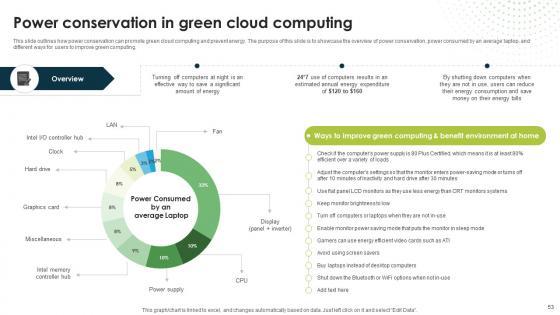This slide outlines how power conservation can promote green cloud computing and prevent energy. The purpose of this slide is to showcase the overview of power conservation, power consumed by an average laptop, and different ways for users to improve green computing.Boost your pitch with our creative Power Conservation In Green Cloud Computing Eco Friendly Computing IT. Deliver an awe-inspiring pitch that will mesmerize everyone. Using these presentation templates you will surely catch everyones attention. You can browse the ppts collection on our website. We have researchers who are experts at creating the right content for the templates. So you do not have to invest time in any additional work. Just grab the template now and use them. This slide outlines how power conservation can promote green cloud computing and prevent energy. The purpose of this slide is to showcase the overview of power conservation, power consumed by an average laptop, and different ways for users to improve green computing.