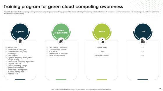 This slide describes the training program for green cloud computing awareness. The purpose of this slide is to highlight the training schedule for Green IT awareness and the main components include agenda, system requirements, mode and cost of the training.If your project calls for a presentation, then Slidegeeks is your go-to partner because we have professionally designed, easy-to-edit templates that are perfect for any presentation. After downloading, you can easily edit Training Program For Green Cloud Computing Awareness Eco Friendly Computing IT and make the changes accordingly. You can rearrange slides or fill them with different images. Check out all the handy templates This slide describes the training program for green cloud computing awareness. The purpose of this slide is to highlight the training schedule for Green IT awareness and the main components include agenda, system requirements, mode and cost of the training.