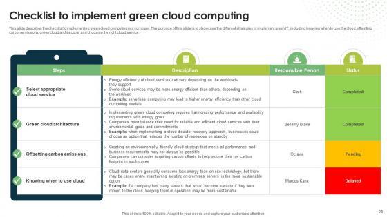 This slide describes the checklist to implementing green cloud computing in a company. The purpose of this slide is to showcase the different strategies to implement green IT, including knowing when to use the cloud, offsetting carbon emissions, green cloud architecture, and choosing the right cloud service.There are so many reasons you need a Checklist To Implement Green Cloud Computing Eco Friendly Computing IT. The first reason is you can not spend time making everything from scratch, Thus, Slidegeeks has made presentation templates for you too. You can easily download these templates from our website easily. This slide describes the checklist to implementing green cloud computing in a company. The purpose of this slide is to showcase the different strategies to implement green IT, including knowing when to use the cloud, offsetting carbon emissions, green cloud architecture, and choosing the right cloud service.