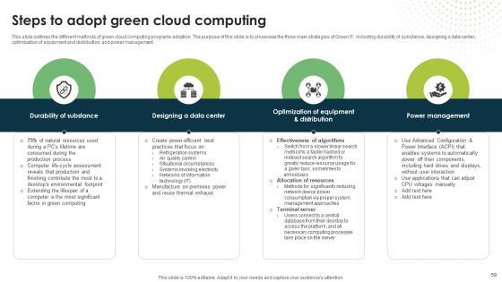 This slide outlines the different methods of green cloud computing programs adoption. The purpose of this slide is to showcase the three main strategies of Green IT, including durability of substance, designing a data center, optimization of equipment and distribution, and power management.Get a simple yet stunning designed Steps To Adopt Green Cloud Computing Eco Friendly Computing IT. It is the best one to establish the tone in your meetings. It is an excellent way to make your presentations highly effective. So, download this PPT today from Slidegeeks and see the positive impacts. Our easy-to-edit Steps To Adopt Green Cloud Computing Eco Friendly Computing IT can be your go-to option for all upcoming conferences and meetings. So, what are you waiting for Grab this template today. This slide outlines the different methods of green cloud computing programs adoption. The purpose of this slide is to showcase the three main strategies of Green IT, including durability of substance, designing a data center, optimization of equipment and distribution, and power management.