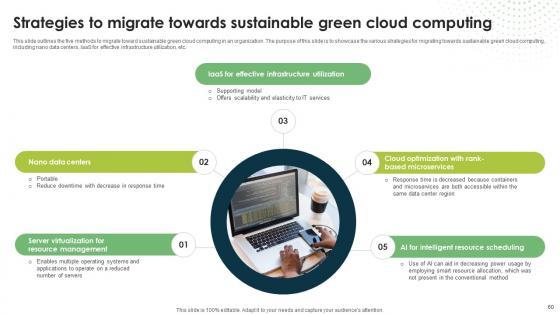 This slide outlines the five methods to migrate toward sustainable green cloud computing in an organization. The purpose of this slide is to showcase the various strategies for migrating towards sustainable green cloud computing, including nano data centers, IaaS for effective infrastructure utilization, etc.Present like a pro with Strategies To Migrate Towards Sustainable Green Cloud Computing Eco Friendly Computing IT. Create beautiful presentations together with your team, using our easy-to-use presentation slides. Share your ideas in real-time and make changes on the fly by downloading our templates. So whether you are in the office, on the go, or in a remote location, you can stay in sync with your team and present your ideas with confidence. With Slidegeeks presentation got a whole lot easier. Grab these presentations today. This slide outlines the five methods to migrate toward sustainable green cloud computing in an organization. The purpose of this slide is to showcase the various strategies for migrating towards sustainable green cloud computing, including nano data centers, IaaS for effective infrastructure utilization, etc.