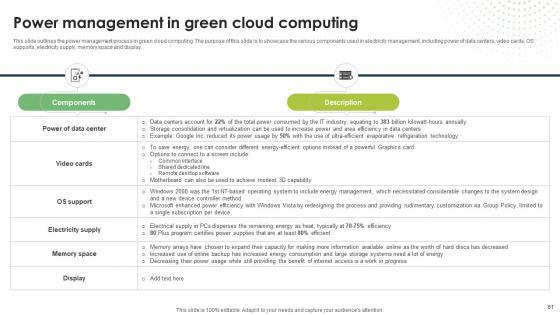 This slide outlines the power management process in green cloud computing. The purpose of this slide is to showcase the various components used in electricity management, including power of data centers, video cards, OS supports, electricity supply, memory space and display.Create an editable Power Management In Green Cloud Computing Eco Friendly Computing IT that communicates your idea and engages your audience. Whether you are presenting a business or an educational presentation, pre-designed presentation templates help save time. Power Management In Green Cloud Computing Eco Friendly Computing IT is highly customizable and very easy to edit, covering many different styles from creative to business presentations. Slidegeeks has creative team members who have crafted amazing templates. So, go and get them without any delay. This slide outlines the power management process in green cloud computing. The purpose of this slide is to showcase the various components used in electricity management, including power of data centers, video cards, OS supports, electricity supply, memory space and display.