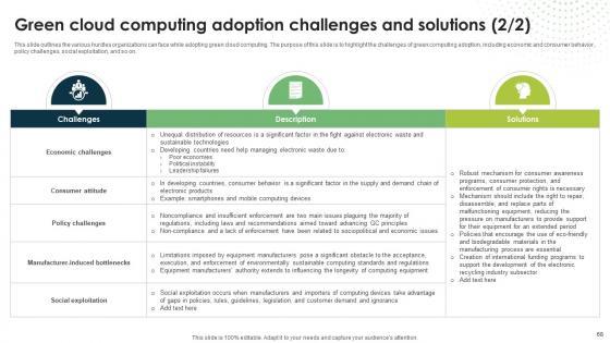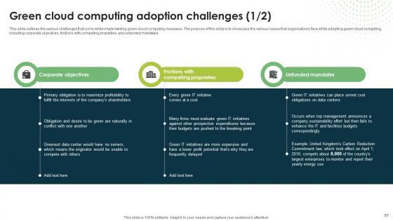 This slide outlines the various challenges that come while implementing green cloud computing measures. The purpose of this slide is to showcase the various issues that organizations face while adopting green cloud computing, including corporate objectives, frictions with competing properties, and unfunded mandates.Whether you have daily or monthly meetings, a brilliant presentation is necessary. Green Cloud Computing Adoption Challenges Eco Friendly Computing IT can be your best option for delivering a presentation. Represent everything in detail using Green Cloud Computing Adoption Challenges Eco Friendly Computing IT and make yourself stand out in meetings. The template is versatile and follows a structure that will cater to your requirements. All the templates prepared by Slidegeeks are easy to download and edit. Our research experts have taken care of the corporate themes as well. So, give it a try and see the results. This slide outlines the various challenges that come while implementing green cloud computing measures. The purpose of this slide is to showcase the various issues that organizations face while adopting green cloud computing, including corporate objectives, frictions with competing properties, and unfunded mandates.