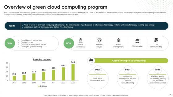 This slide represents the overview of green cloud computing. The purpose of this slide is to showcase the objective of Green IT, its importance, and its market worth. It also includes how green cloud computing can be achieved through cloud computing, material recycling, power management, virtualization and telecommunication.Find a pre-designed and impeccable Overview Of Green Cloud Computing Program Eco Friendly Computing IT. The templates can ace your presentation without additional effort. You can download these easy-to-edit presentation templates to make your presentation stand out from others. So, what are you waiting for Download the template from Slidegeeks today and give a unique touch to your presentation. This slide represents the overview of green cloud computing. The purpose of this slide is to showcase the objective of Green IT, its importance, and its market worth. It also includes how green cloud computing can be achieved through cloud computing, material recycling, power management, virtualization and telecommunication.