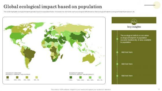 This slide highlights ecological footprint globally based on population factor. It includes key elements such as ecological deficit reserve, total ecological footprint, ecological footprint per person, etc. Pitch your topic with ease and precision using this Global Ecological Impact Based On Population Demonstration Pdf This layout presents information on Global Ecological, Impact Based On Population It is also available for immediate download and adjustment. So, changes can be made in the color, design, graphics or any other component to create a unique layout. This slide highlights ecological footprint globally based on population factor. It includes key elements such as ecological deficit reserve, total ecological footprint, ecological footprint per person, etc.