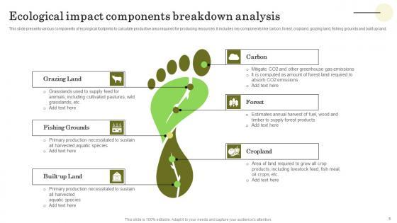 This slide presents various components of ecological footprints to calculate productive area required for producing resources. It includes key components like carbon, forest, cropland, grazing land, fishing grounds and built up land. Showcasing this set of slides titled Ecological Impact Components Breakdown Analysis Microsoft Pdf The topics addressed in these templates are Grazing Land, Fishing Grounds, Carbon, Cropland All the content presented in this PPT design is completely editable. Download it and make adjustments in color, background, font etc. as per your unique business setting. This slide presents various components of ecological footprints to calculate productive area required for producing resources. It includes key components like carbon, forest, cropland, grazing land, fishing grounds and built up land.