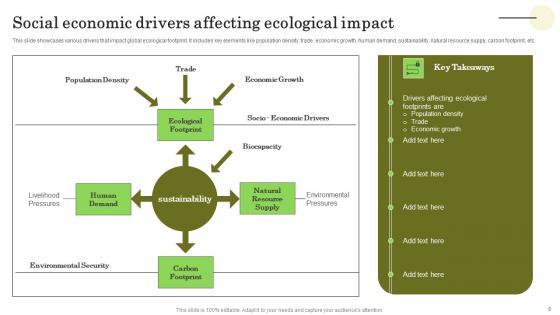 This slide showcases various drivers that impact global ecological footprint. It includes key elements like population density, trade, economic growth, human demand, sustainability, natural resource supply, carbon footprint, etc. Pitch your topic with ease and precision using this Social Economic Drivers Affecting Ecological Impact Introduction Pdf This layout presents information on Ecological Footprint, Human Demand, Natural Resource Supply It is also available for immediate download and adjustment. So, changes can be made in the color, design, graphics or any other component to create a unique layout. This slide showcases various drivers that impact global ecological footprint. It includes key elements like population density, trade, economic growth, human demand, sustainability, natural resource supply, carbon footprint, etc.