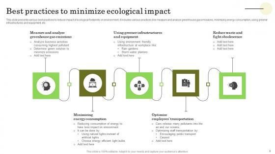 This slide presents various best practices to reduce impact of ecological footprints on environment, it includes various practices like measure and analyze greenhouse gas emissions, minimizing energy consumption, using greener infrastructures and equipment, etc. Showcasing this set of slides titled Best Practices To Minimize Ecological Impact Pictures Pdf The topics addressed in these templates are Greenhouse Gas Emissions, Greener Infrastructures, Optimize Employees All the content presented in this PPT design is completely editable. Download it and make adjustments in color, background, font etc. as per your unique business setting. This slide presents various best practices to reduce impact of ecological footprints on environment, it includes various practices like measure and analyze greenhouse gas emissions, minimizing energy consumption, using greener infrastructures and equipment, etc.