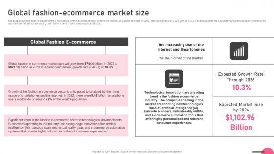 The purpose of this slide is to highlight the market size of the global fashion e-commerce industry, including its share in 2022, forecasted value in 2026, and its CAGR. It also depicts the rising demand and usage of smartphones and the internet, which are core growth factors behind the increasing market size. Formulating a presentation can take up a lot of effort and time, so the content and message should always be the primary focus. The visuals of the PowerPoint can enhance the presenters message, so our Global Fashion Ecommerce Market Size Boutique Business Background Pdf was created to help save time. Instead of worrying about the design, the presenter can concentrate on the message while our designers work on creating the ideal templates for whatever situation is needed. Slidegeeks has experts for everything from amazing designs to valuable content, we have put everything into Global Fashion Ecommerce Market Size Boutique Business Background Pdf The purpose of this slide is to highlight the market size of the global fashion e-commerce industry, including its share in 2022, forecasted value in 2026, and its CAGR. It also depicts the rising demand and usage of smartphones and the internet, which are core growth factors behind the increasing market size.