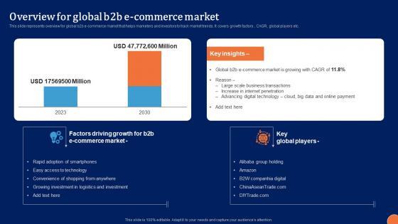 This slide represents overview for global B2b e-commerce market that helps marketers and investors to track market trends. It covers growth factors , CAGR, global players etc. Welcome to our selection of the Strategic Ecommerce Plan For B2B Enterprises Overview For Global B2b E Commerce Market Template PDF. These are designed to help you showcase your creativity and bring your sphere to life. Planning and Innovation are essential for any business that is just starting out. This collection contains the designs that you need for your everyday presentations. All of our PowerPoints are 100 percent editable, so you can customize them to suit your needs. This multi-purpose template can be used in various situations. Grab these presentation templates today