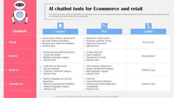 This slide showcases AI based chatbots that can help retail and ecommerce companies to provide seamless experience to customers and increase company sales. Its key elements are chatbots, features, pros and usability Presenting this PowerPoint presentation, titled AI Chatbot Tools For Ecommerce And Retail AI Bot Application For Various Industries Template Pdf, with topics curated by our researchers after extensive research. This editable presentation is available for immediate download and provides attractive features when used. Download now and captivate your audience. Presenting this AI Chatbot Tools For Ecommerce And Retail AI Bot Application For Various Industries Template Pdf. Our researchers have carefully researched and created these slides with all aspects taken into consideration. This is a completely customizable AI Chatbot Tools For Ecommerce And Retail AI Bot Application For Various Industries Template Pdf that is available for immediate downloading. Download now and make an impact on your audience. Highlight the attractive features available with our PPTs. This slide showcases AI based chatbots that can help retail and ecommerce companies to provide seamless experience to customers and increase company sales. Its key elements are chatbots, features, pros and usability