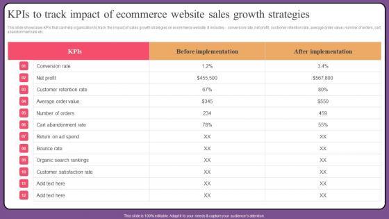 This slide showcases KPIs that can help organization to track the impact of sales growth strategies on ecommerce website. It includes conversion rate, net profit, customer retention rate, average order value, number of orders, cart abandonment rate etc. The KPIs To Track Impact Of Ecommerce Website Sales Growth Strategies Rules Pdf is a compilation of the most recent design trends as a series of slides. It is suitable for any subject or industry presentation, containing attractive visuals and photo spots for businesses to clearly express their messages. This template contains a variety of slides for the user to input data, such as structures to contrast two elements, bullet points, and slides for written information. Slidegeeks is prepared to create an impression. This slide showcases KPIs that can help organization to track the impact of sales growth strategies on ecommerce website. It includes conversion rate, net profit, customer retention rate, average order value, number of orders, cart abandonment rate etc.