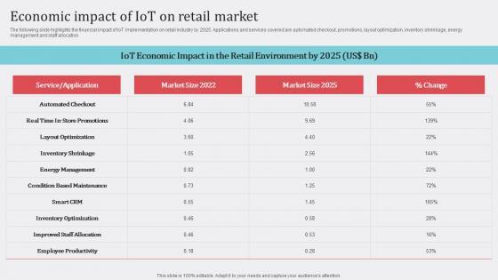 The following slide highlights the financial impact of IoT implementation on retail industry by 2025. Applications and services covered are automated checkout, promotions, layout optimization, inventory shrinkage, energy management and staff allocation Create an editable Economic Impact Of IoT How Industrial IoT Is Changing Worldwide Diagrams Pdf that communicates your idea and engages your audience. Whether you are presenting a business or an educational presentation, pre designed presentation templates help save time. Economic Impact Of IoT How Industrial IoT Is Changing Worldwide Diagrams Pdf is highly customizable and very easy to edit, covering many different styles from creative to business presentations. Slidegeeks has creative team members who have crafted amazing templates. So, go and get them without any delay. The following slide highlights the financial impact of IoT implementation on retail industry by 2025. Applications and services covered are automated checkout, promotions, layout optimization, inventory shrinkage, energy management and staff allocation