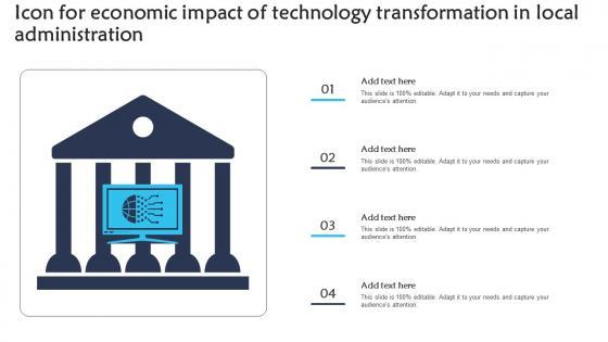 Pitch your topic with ease and precision using this Icon For Economic Impact Of Technology Transformation In Local Administration Portrait pdf. This layout presents information on Icon, Economic Impact, Technology Transformation, Local Administration. It is also available for immediate download and adjustment. So, changes can be made in the color, design, graphics or any other component to create a unique layout. Our Icon For Economic Impact Of Technology Transformation In Local Administration Portrait pdf are topically designed to provide an attractive backdrop to any subject. Use them to look like a presentation pro.