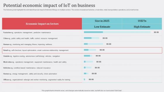 The following slide highlights the estimated financial impact of internet of things on multiple sectors. The sectors included are factories, smart cities, retail, transportation, operations, and smart homes qSlidegeeks has constructed Potential Economic Impact How Industrial IoT Is Changing Worldwide Graphics Pdf after conducting extensive research and examination. These presentation templates are constantly being generated and modified based on user preferences and critiques from editors. Here, you will find the most attractive templates for a range of purposes while taking into account ratings and remarks from users regarding the content. This is an excellent jumping off point to explore our content and will give new users an insight into our top notch PowerPoint Templates. The following slide highlights the estimated financial impact of internet of things on multiple sectors. The sectors included are factories, smart cities, retail, transportation, operations, and smart homes