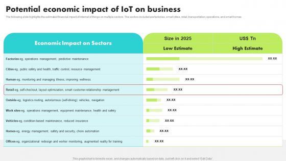 The following slide highlights the estimated financial impact of internet of things on multiple sectors. The sectors included are factories, smart cities, retail, transportation, operations, and smart homes Welcome to our selection of the IoT Application In Global Potential Economic Impact Of IoT On Business Slides Pdf These are designed to help you showcase your creativity and bring your sphere to life. Planning and Innovation are essential for any business that is just starting out. This collection contains the designs that you need for your everyday presentations. All of our PowerPoints are 100 percent editable, so you can customize them to suit your needs. This multi-purpose template can be used in various situations. Grab these presentation templates today The following slide highlights the estimated financial impact of internet of things on multiple sectors. The sectors included are factories, smart cities, retail, transportation, operations, and smart homes
