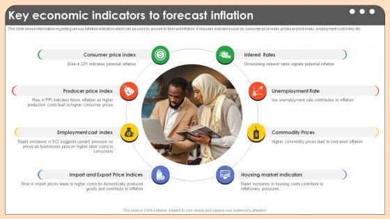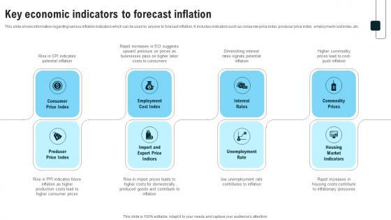 This slide shows information regarding various inflation indicators which can be used by anyone to forecast inflation. It includes indicators such as consumer price index, producer price index, employment cost index, etc. Retrieve professionally designed Key Economic Indicators To Forecast Inflation Strategies For Inflation A Tactical Guide Fin SS V to effectively convey your message and captivate your listeners. Save time by selecting pre-made slideshows that are appropriate for various topics, from business to educational purposes. These themes come in many different styles, from creative to corporate, and all of them are easily adjustable and can be edited quickly. Access them as PowerPoint templates or as Google Slides themes. You do not have to go on a hunt for the perfect presentation because Slidegeeks got you covered from everywhere. This slide shows information regarding various inflation indicators which can be used by anyone to forecast inflation. It includes indicators such as consumer price index, producer price index, employment cost index, etc.
