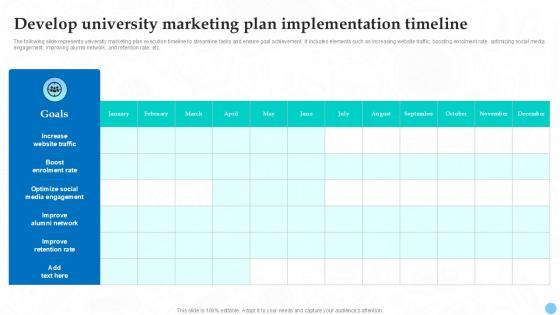 The following slide represents university marketing plan execution timeline to streamline tasks and ensure goal achievement. It includes elements such as increasing website traffic, boosting enrolment rate, optimizing social media engagement, improving alumni network, and retention rate, etc. Formulating a presentation can take up a lot of effort and time, so the content and message should always be the primary focus. The visuals of the PowerPoint can enhance the presenters message, so our Develop University Marketing Plan Higher Education Ppt Example Strategy SS V was created to help save time. Instead of worrying about the design, the presenter can concentrate on the message while our designers work on creating the ideal templates for whatever situation is needed. Slidegeeks has experts for everything from amazing designs to valuable content, we have put everything into Develop University Marketing Plan Higher Education Ppt Example Strategy SS V The following slide represents university marketing plan execution timeline to streamline tasks and ensure goal achievement. It includes elements such as increasing website traffic, boosting enrolment rate, optimizing social media engagement, improving alumni network, and retention rate, etc.