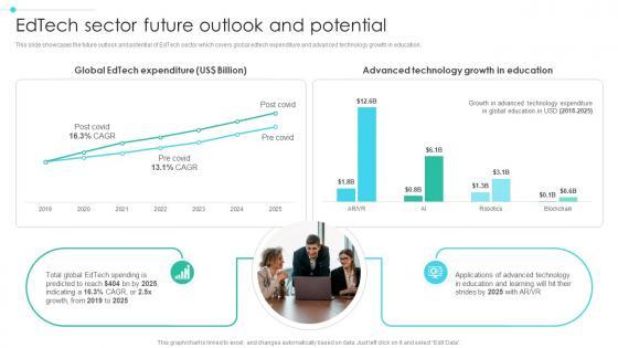 This slide showcases the future outlook and potential of EdTech sector which covers global edtech expenditure and advanced technology growth in education. Slidegeeks is here to make your presentations a breeze with Global Digital Education Edtech Sector Future Outlook And Potential IR SS V With our easy-to-use and customizable templates, you can focus on delivering your ideas rather than worrying about formatting. With a variety of designs to choose from, you are sure to find one that suits your needs. And with animations and unique photos, illustrations, and fonts, you can make your presentation pop. So whether you are giving a sales pitch or presenting to the board, make sure to check out Slidegeeks first This slide showcases the future outlook and potential of EdTech sector which covers global edtech expenditure and advanced technology growth in education.