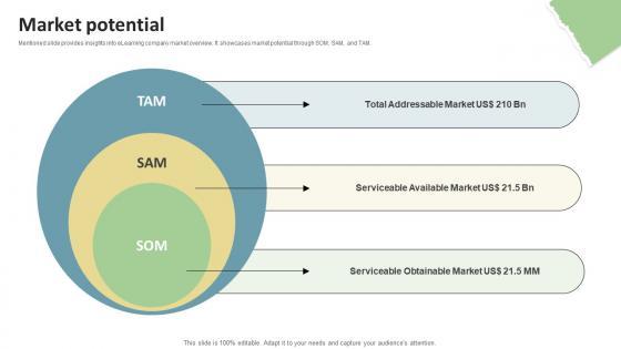 Mentioned slide provides insights into eLearning company market overview. It showcases market potential through SOM, SAM, and TAM. Are you in need of a template that can accommodate all of your creative concepts This one is crafted professionally and can be altered to fit any style. Use it with Google Slides or PowerPoint. Include striking photographs, symbols, depictions, and other visuals. Fill, move around, or remove text boxes as desired. Test out color palettes and font mixtures. Edit and save your work, or work with colleagues. Download Market Potential Education Platform Investor Funding Elevator Pitch Deck and observe how to make your presentation outstanding. Give an impeccable presentation to your group and make your presentation unforgettable. Mentioned slide provides insights into eLearning company market overview. It showcases market potential through SOM, SAM, and TAM.