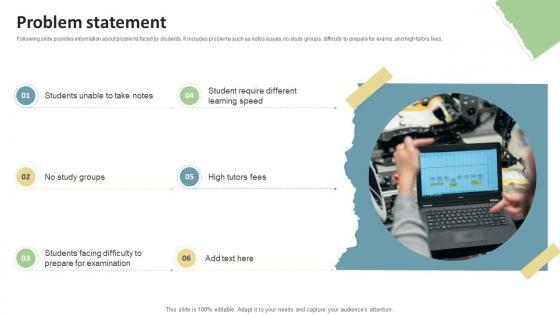 Following slide provides information about problems faced by students. It includes problems such as notes issues, no study groups, difficulty to prepare for exams, and high tutors fees. Formulating a presentation can take up a lot of effort and time, so the content and message should always be the primary focus. The visuals of the PowerPoint can enhance the presenters message, so our Problem Statement Education Platform Investor Funding Elevator Pitch Deck was created to help save time. Instead of worrying about the design, the presenter can concentrate on the message while our designers work on creating the ideal templates for whatever situation is needed. Slidegeeks has experts for everything from amazing designs to valuable content, we have put everything into Problem Statement Education Platform Investor Funding Elevator Pitch Deck. Following slide provides information about problems faced by students. It includes problems such as notes issues, no study groups, difficulty to prepare for exams, and high tutors fees.