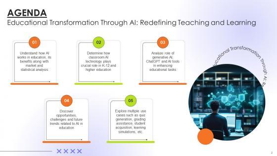 Find a pre-designed and impeccable Agenda Educational Transformation Through AI Redefining Teaching And Learning AI SS V. The templates can ace your presentation without additional effort. You can download these easy-to-edit presentation templates to make your presentation stand out from others. So, what are you waiting for Download the template from Slidegeeks today and give a unique touch to your presentation. Our Agenda Educational Transformation Through AI Redefining Teaching And Learning AI SS V are topically designed to provide an attractive backdrop to any subject. Use them to look like a presentation pro.