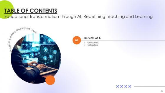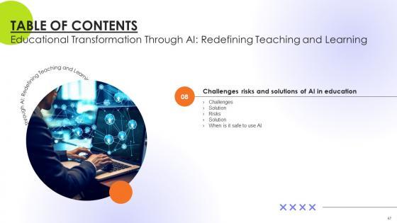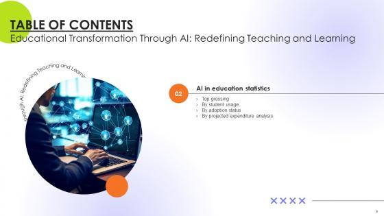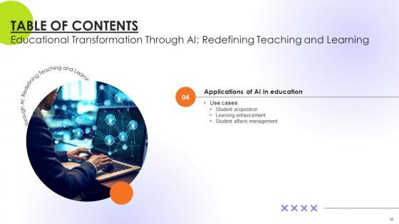 Formulating a presentation can take up a lot of effort and time, so the content and message should always be the primary focus. The visuals of the PowerPoint can enhance the presenters message, so our Table Of Contents For Educational Transformation Through AI Redefining Teaching And Learning AI SS V was created to help save time. Instead of worrying about the design, the presenter can concentrate on the message while our designers work on creating the ideal templates for whatever situation is needed. Slidegeeks has experts for everything from amazing designs to valuable content, we have put everything into Table Of Contents For Educational Transformation Through AI Redefining Teaching And Learning AI SS V Our Table Of Contents For Educational Transformation Through AI Redefining Teaching And Learning AI SS V are topically designed to provide an attractive backdrop to any subject. Use them to look like a presentation pro.