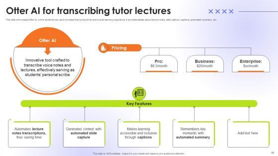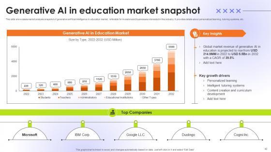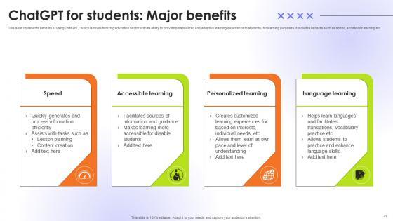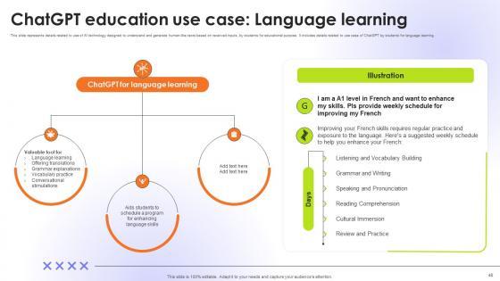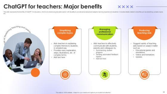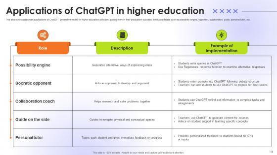 This Applications Of ChatGPT In Education And Learning ChatGPT CD V is a primer on how to capitalize on business opportunities through planning, innovation, and market intelligence. The content-ready format of the complete deck will make your job as a decision-maker a lot easier. Use this ready-made PowerPoint Template to help you outline an extensive and legible plan to capture markets and grow your company on the right path, at an exponential pace. What is even more amazing is that this presentation is completely editable and 100 percent customizable. This fifty two-slide complete deck helps you impress a roomful of people with your expertise in business and even presentation. Craft such a professional and appealing presentation for that amazing recall value. Download now. Our Applications Of ChatGPT In Education And Learning ChatGPT CD V are topically designed to provide an attractive backdrop to any subject. Use them to look like a presentation pro.