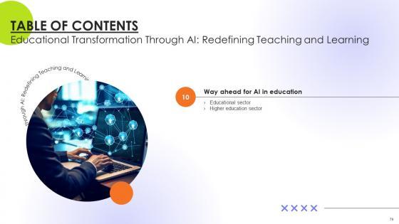 Make sure to capture your audiences attention in your business displays with our gratis customizable Table Of Contents Educational Transformation Through AI Redefining Teaching And Learning AI SS V. These are great for business strategies, office conferences, capital raising or task suggestions. If you desire to acquire more customers for your tech business and ensure they stay satisfied, create your own sales presentation with these plain slides. Our Table Of Contents Educational Transformation Through AI Redefining Teaching And Learning AI SS V are topically designed to provide an attractive backdrop to any subject. Use them to look like a presentation pro.