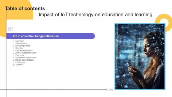 Explore a selection of the finest Impact Of IoT Technology On Education And Learning Table Of Contents IoT SS V here. With a plethora of professionally designed and pre-made slide templates, you can quickly and easily find the right one for your upcoming presentation. You can use our Impact Of IoT Technology On Education And Learning Table Of Contents IoT SS V to effectively convey your message to a wider audience. Slidegeeks has done a lot of research before preparing these presentation templates. The content can be personalized and the slides are highly editable. Grab templates today from Slidegeeks. Our Impact Of IoT Technology On Education And Learning Table Of Contents IoT SS V are topically designed to provide an attractive backdrop to any subject. Use them to look like a presentation pro.