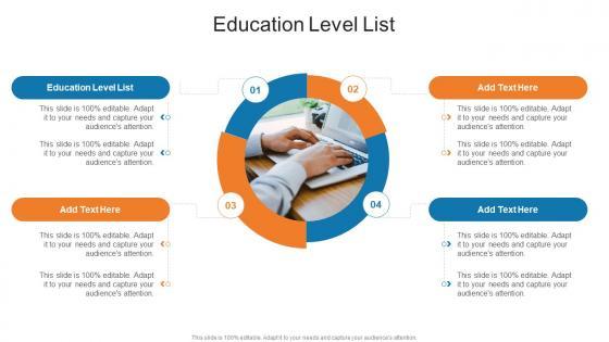 Introducing our well-designed Education Level List In Powerpoint And Google Slides Cpb. This PowerPoint design presents information on topics like Education Level List. As it is predesigned it helps boost your confidence level. It also makes you a better presenter because of its high-quality content and graphics. This PPT layout can be downloaded and used in different formats like PDF, PNG, and JPG. Not only this, it is available in both Standard Screen and Widescreen aspect ratios for your convenience. Therefore, click on the download button now to persuade and impress your audience. Our Education Level List In Powerpoint And Google Slides Cpb are topically designed to provide an attractive backdrop to any subject. Use them to look like a presentation pro.