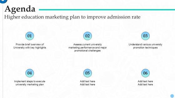 Boost your pitch with our creative Agenda Higher Education Marketing Plan Ppt Sample Strategy SS V. Deliver an awe-inspiring pitch that will mesmerize everyone. Using these presentation templates you will surely catch everyones attention. You can browse the ppts collection on our website. We have researchers who are experts at creating the right content for the templates. So you do not have to invest time in any additional work. Just grab the template now and use them. Our Agenda Higher Education Marketing Plan Ppt Sample Strategy SS V are topically designed to provide an attractive backdrop to any subject. Use them to look like a presentation pro.