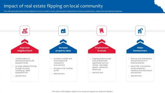 This slide represents impact of house flipping on local community. It covers improvement in neighborhood, increase in property value, employment and helping homeowners. The best PPT templates are a great way to save time, energy, and resources. Slidegeeks have 100 percent editable powerpoint slides making them incredibly versatile. With these quality presentation templates, you can create a captivating and memorable presentation by combining visually appealing slides and effectively communicating your message. Download Impact Of Real Estate Flipping On Deploying Effective Property Flipping Strategies Designs Pdf from Slidegeeks and deliver a wonderful presentation. This slide represents impact of house flipping on local community. It covers improvement in neighborhood, increase in property value, employment and helping homeowners.