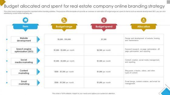 This slide covers budget assigned for important online branding activities. The purpose of this template is to provide an overview on estimation of budget range set, spent, for items such as website development, SEO, pay per click advertising, social media marketing, etc. Create an editable A71 Blueprint For Effective Budget Allocated And Spent For Real Estate Company Online Strategy SS V that communicates your idea and engages your audience. Whether you are presenting a business or an educational presentation, pre-designed presentation templates help save time. A71 Blueprint For Effective Budget Allocated And Spent For Real Estate Company Online Strategy SS V is highly customizable and very easy to edit, covering many different styles from creative to business presentations. Slidegeeks has creative team members who have crafted amazing templates. So, go and get them without any delay. This slide covers budget assigned for important online branding activities. The purpose of this template is to provide an overview on estimation of budget range set, spent, for items such as website development, SEO, pay per click advertising, social media marketing, etc.