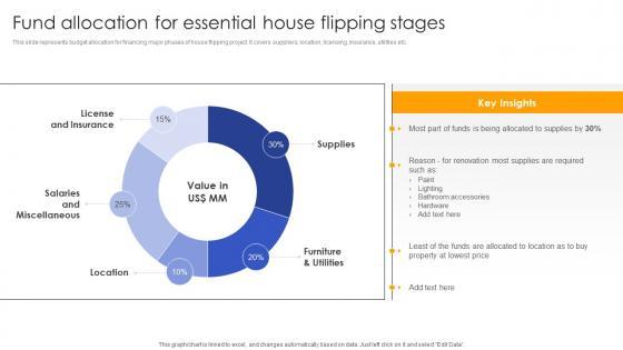 This slide represents budget allocation for financing major phases of house flipping project. It covers suppliers, location, licensing, insurance, utilities etc. Welcome to our selection of the Fund Allocation For Essential House Flipping Effective Real Estate Flipping Approaches Slides Pdf. These are designed to help you showcase your creativity and bring your sphere to life. Planning and Innovation are essential for any business that is just starting out. This collection contains the designs that you need for your everyday presentations. All of our PowerPoints are 100 percent editable, so you can customize them to suit your needs. This multi purpose template can be used in various situations. Grab these presentation templates today This slide represents budget allocation for financing major phases of house flipping project. It covers suppliers, location, licensing, insurance, utilities etc.