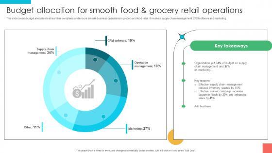 This slide covers budget allocation to streamline complexity and ensure smooth business operations in grocery and food retail. It involves supply chain management, CRM software and marketing. Do you have to make sure that everyone on your team knows about any specific topic I yes, then you should give Marketing Strategies For Effective Budget Allocation For Smooth Food And Grocery a try. Our experts have put a lot of knowledge and effort into creating this impeccable Marketing Strategies For Effective Budget Allocation For Smooth Food And Grocery. You can use this template for your upcoming presentations, as the slides are perfect to represent even the tiniest detail. You can download these templates from the Slidegeeks website and these are easy to edit. So grab these today This slide covers budget allocation to streamline complexity and ensure smooth business operations in grocery and food retail. It involves supply chain management, CRM software and marketing.