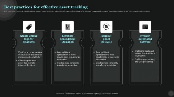 This slide covers best practices for effective asset tracking. It involves strategies such as creating unique tags, eliminate spreadsheet utilization, map out asset lifecycle and invest in automated software.This Best Practices For Effective Asset Tracking Tech Asset Management Graphics Pdf from Slidegeeks makes it easy to present information on your topic with precision. It provides customization options, so you can make changes to the colors, design, graphics, or any other component to create a unique layout. It is also available for immediate download, so you can begin using it right away. Slidegeeks has done good research to ensure that you have everything you need to make your presentation stand out. Make a name out there for a brilliant performance. This slide covers best practices for effective asset tracking. It involves strategies such as creating unique tags, eliminate spreadsheet utilization, map out asset lifecycle and invest in automated software.