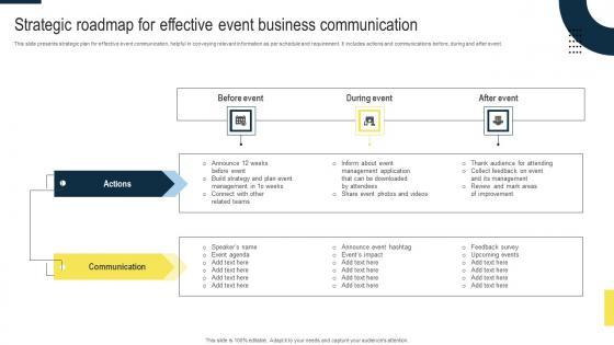 This slide presents strategic plan for effective event communication, helpful in conveying relevant information as per schedule and requirement. It includes actions and communications before, during and after event. Showcasing this set of slides titled Strategic Roadmap For Effective Event Business Communication Formats Pdf. The topics addressed in these templates are Before Event, During Event, After Event. All the content presented in this PPT design is completely editable. Download it and make adjustments in color, background, font etc. as per your unique business setting. This slide presents strategic plan for effective event communication, helpful in conveying relevant information as per schedule and requirement. It includes actions and communications before, during and after event.