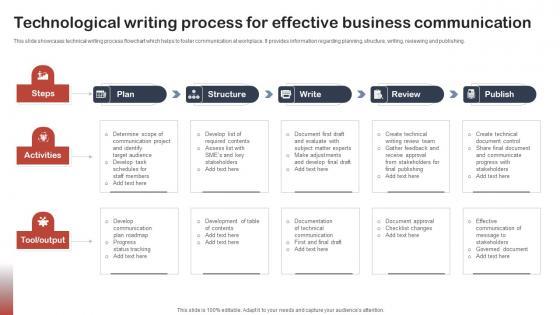 This slide showcases technical writing process flowchart which helps to foster communication at workplace. It provides information regarding planning, structure, writing, reviewing and publishing. Showcasing this set of slides titled Technological Writing Process For Effective Business Communication Topics Pdf. The topics addressed in these templates are Plan, Structure, Write. All the content presented in this PPT design is completely editable. Download it and make adjustments in color, background, font etc. as per your unique business setting. This slide showcases technical writing process flowchart which helps to foster communication at workplace. It provides information regarding planning, structure, writing, reviewing and publishing.