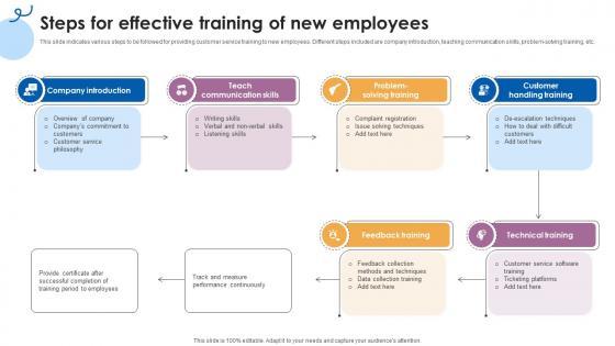 This slide indicates various steps to be followed for providing customer service training to new employees. Different steps included are company introduction, teaching communication skills, problem-solving training, etc. Find a pre-designed and impeccable Steps For Effective Training Of New Employees Customer Service Training Ppt Sample The templates can ace your presentation without additional effort. You can download these easy-to-edit presentation templates to make your presentation stand out from others. So, what are you waiting for Download the template from Slidegeeks today and give a unique touch to your presentation. This slide indicates various steps to be followed for providing customer service training to new employees. Different steps included are company introduction, teaching communication skills, problem-solving training, etc.